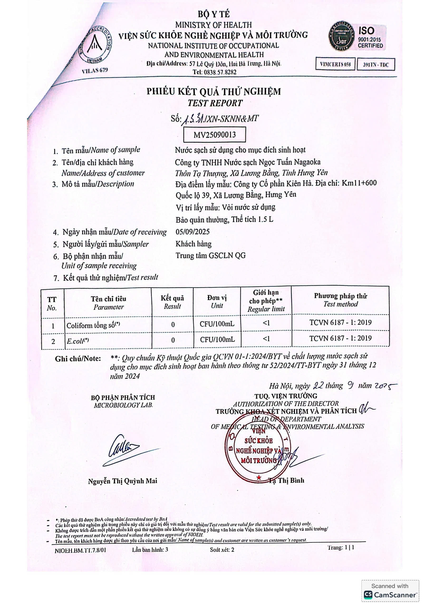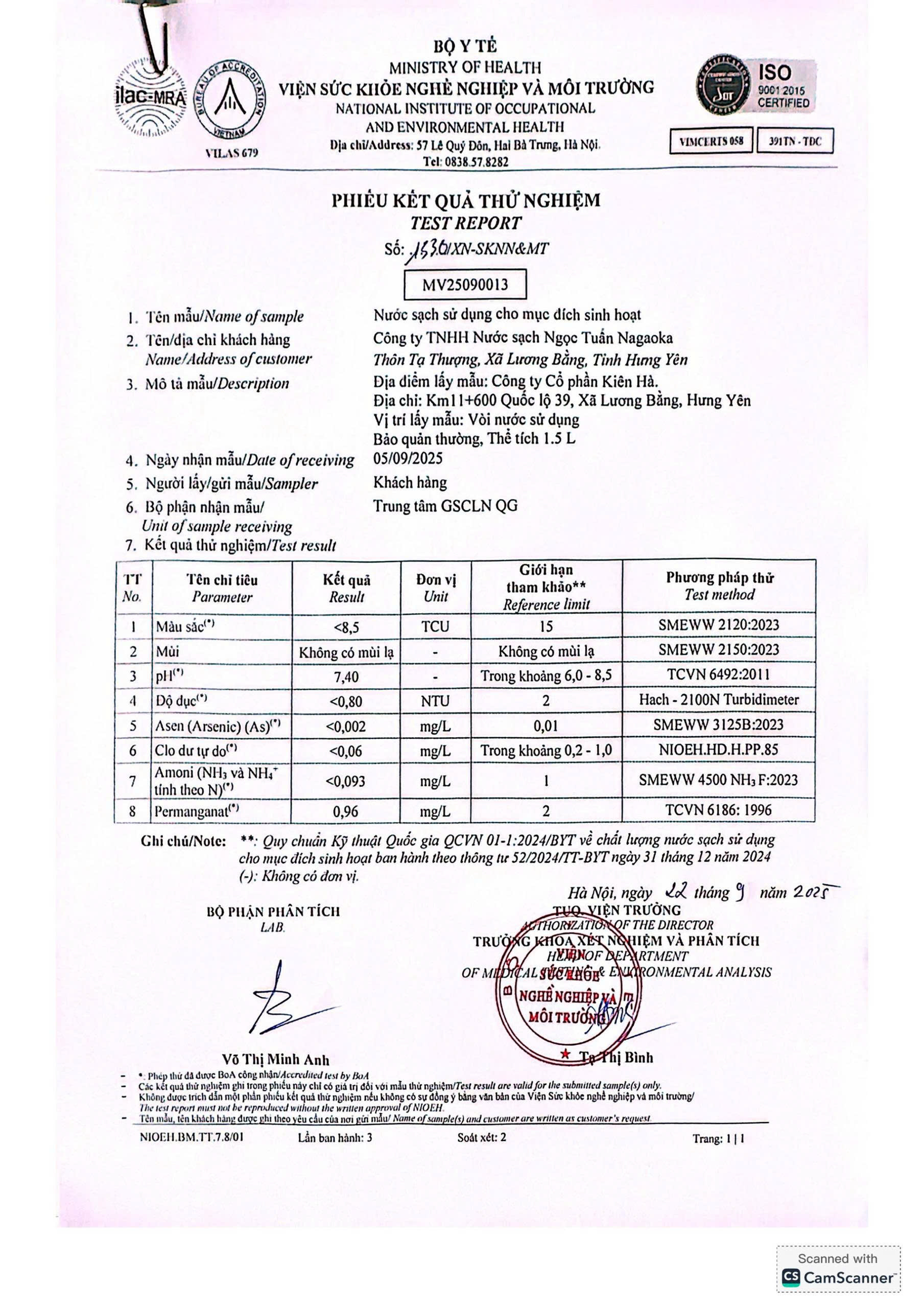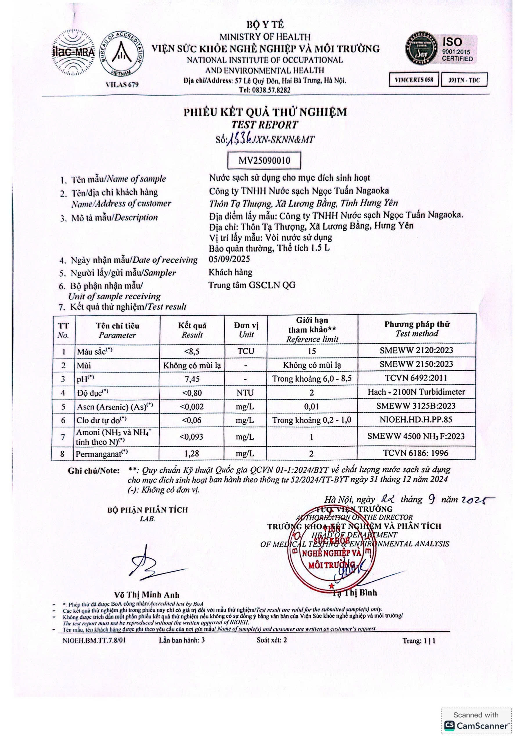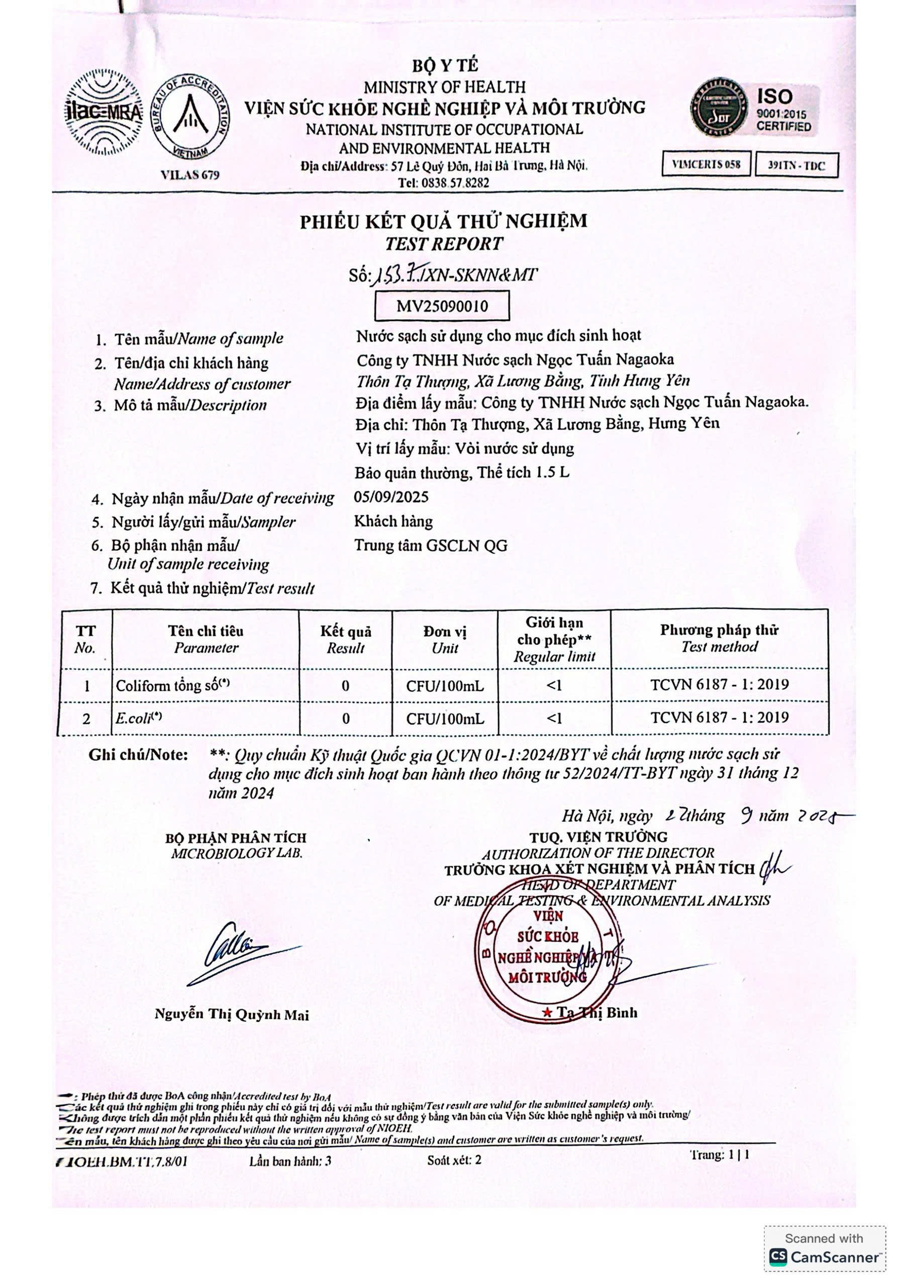 Kết quả nội kiểm mẫu nước tháng 9/2025 với 10 chỉ tiêu nhóm A theo Thông tư số 52/2024/TT-BYT ngày 31/12/2024 do Viện Sức khỏe nghề nghiệp và môi trường thực hiện.