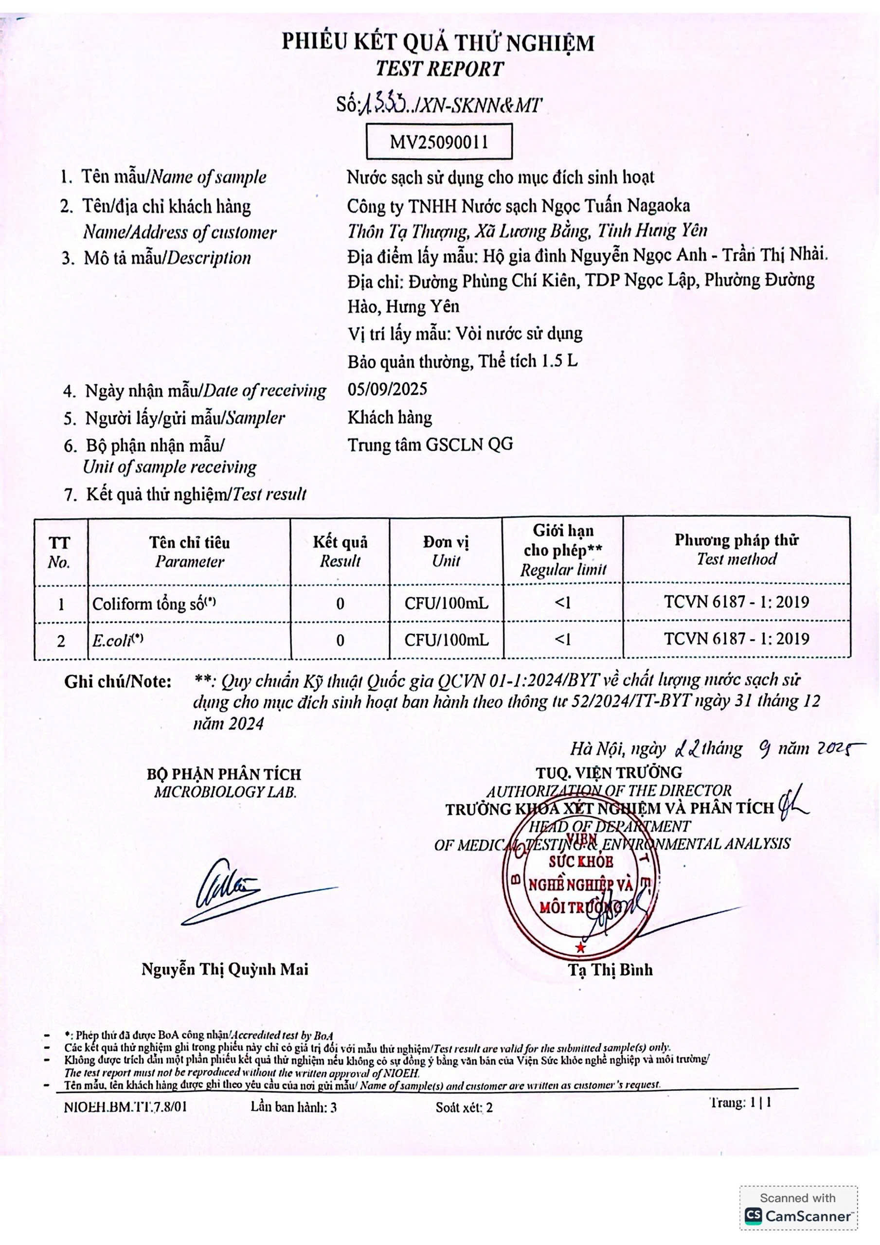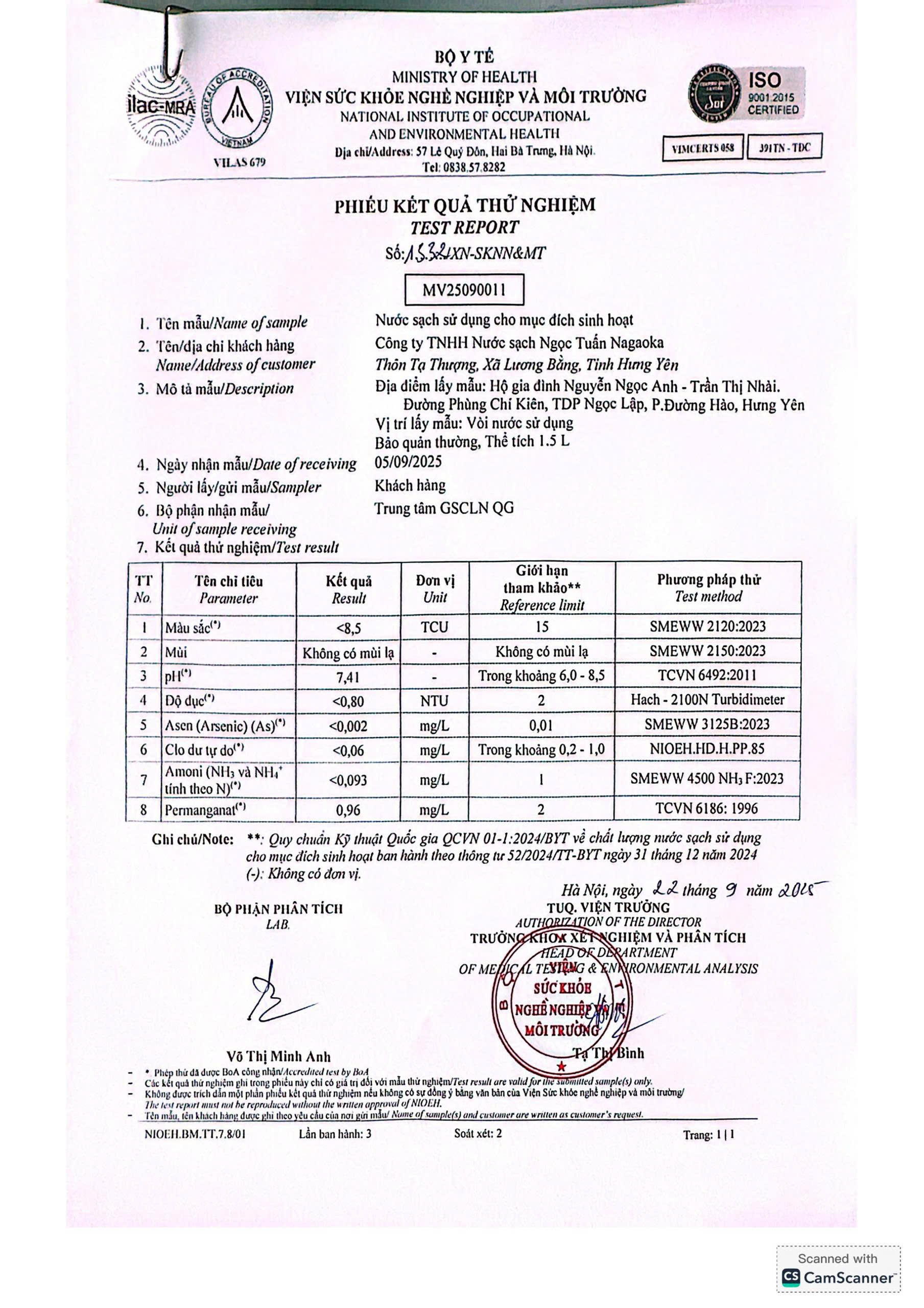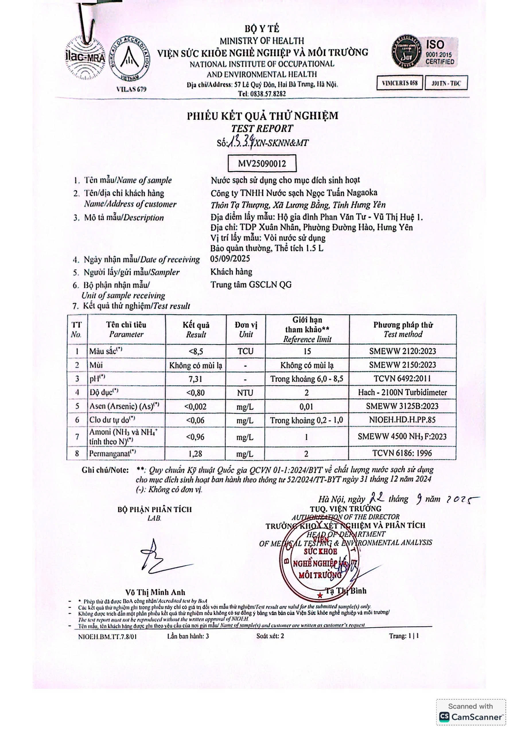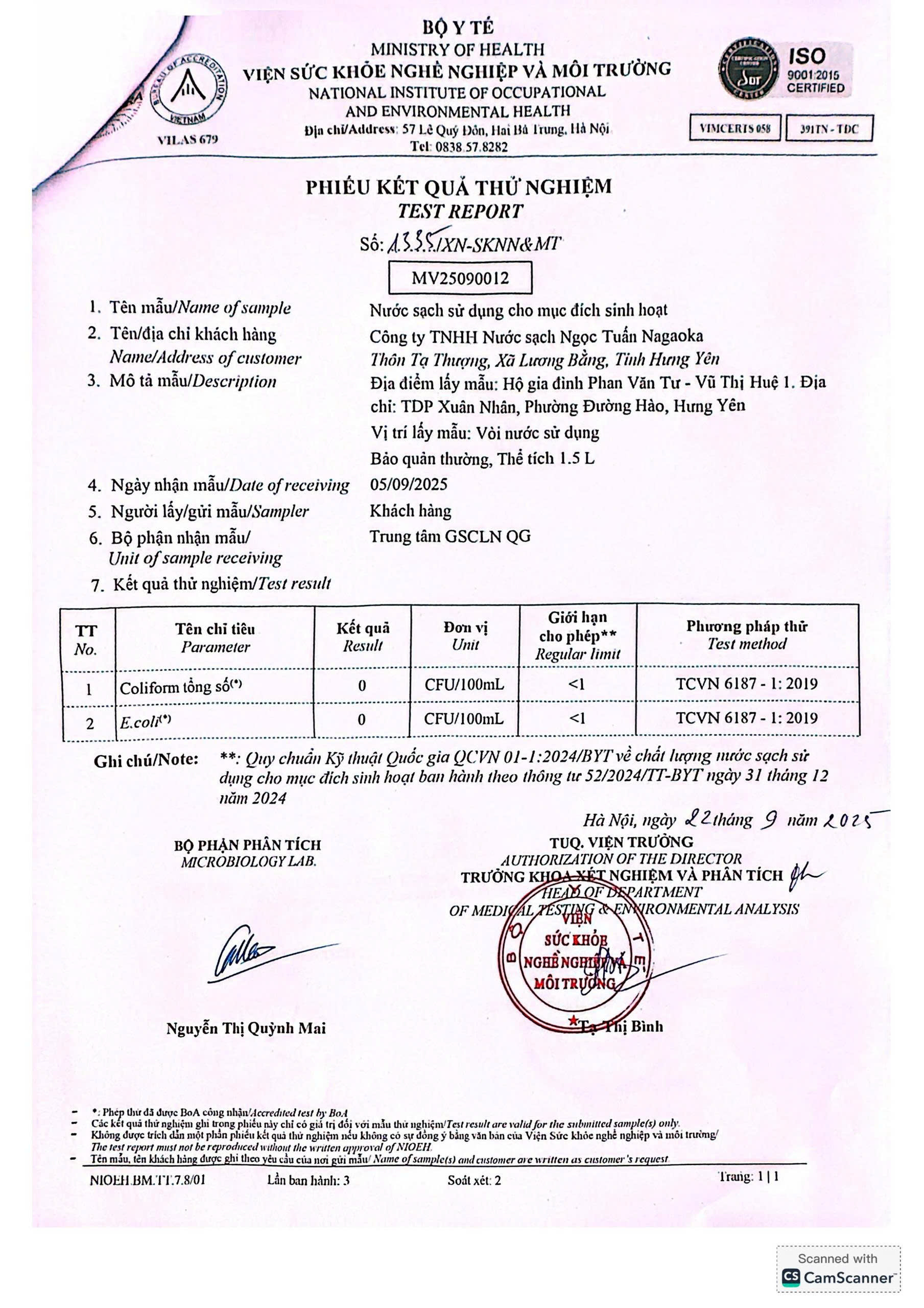 Kết quả nội kiểm mẫu nước tháng 9/2025 với 10 chỉ tiêu nhóm A theo Thông tư số 52/2024/TT-BYT ngày 31/12/2024 do Viện Sức khỏe nghề nghiệp và môi trường thực hiện.