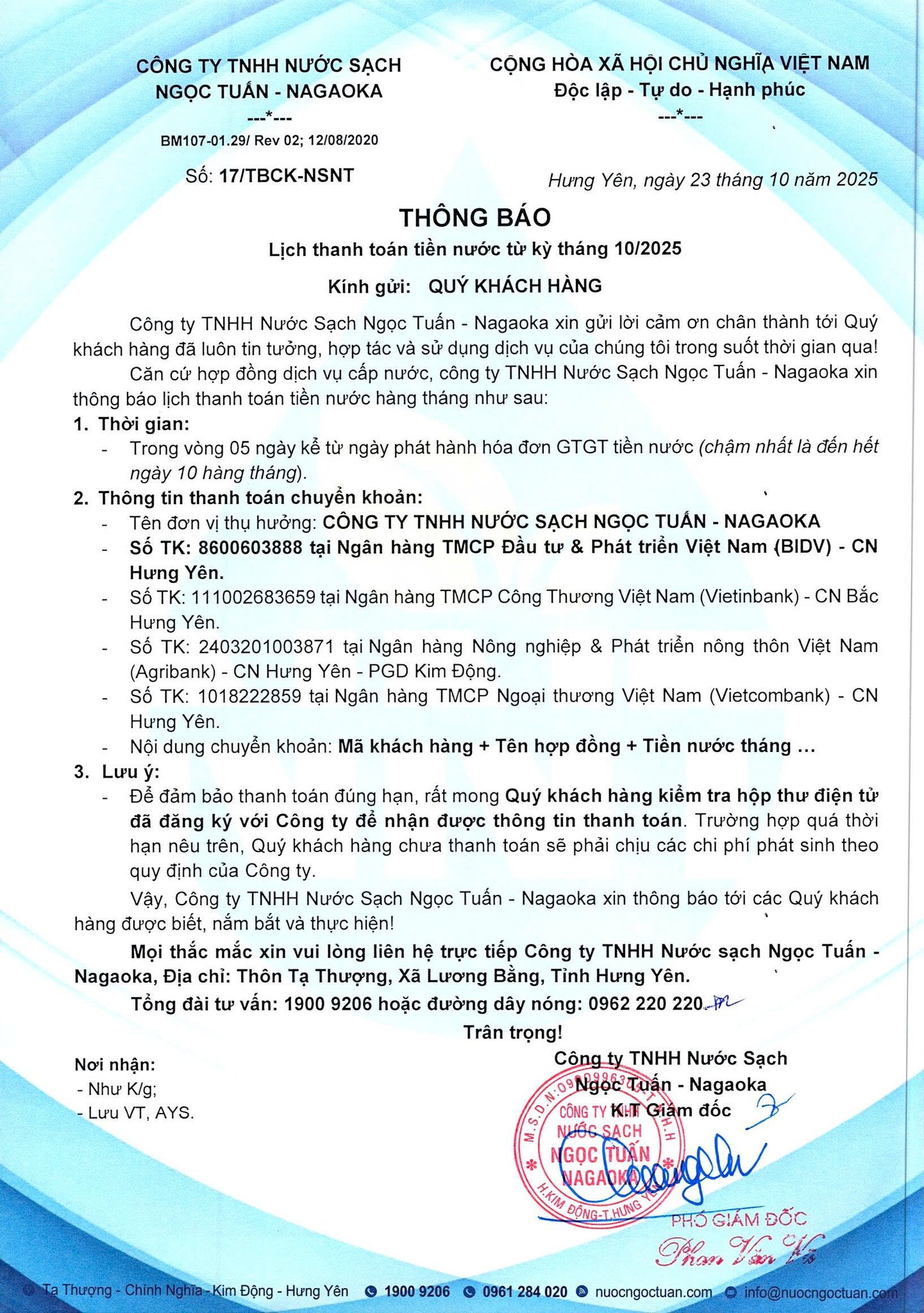 Công ty TNHH nước sạch Ngọc Tuấn - Nagaoka xin thông báo tới Quý khách hàng Cơ quan, Doanh nghiệp "Lịch thanh toán tiền nước từ kỳ tháng 10/2025"Trân trọng!