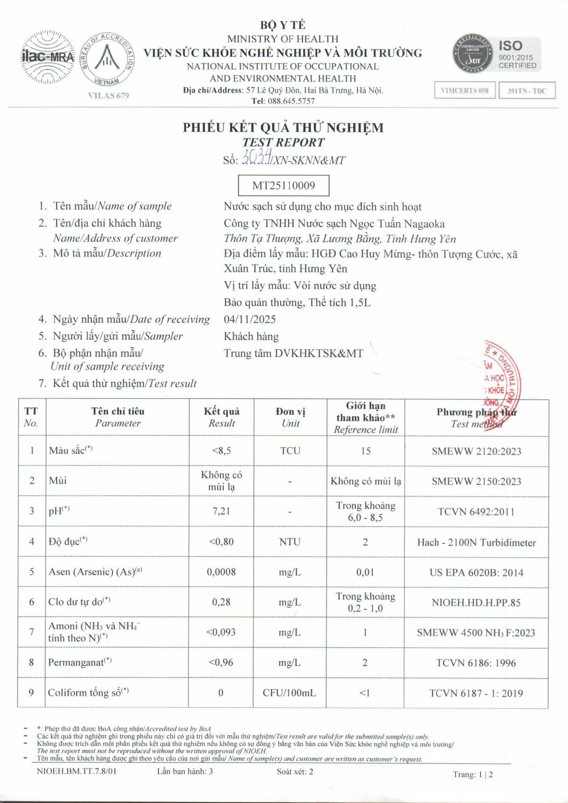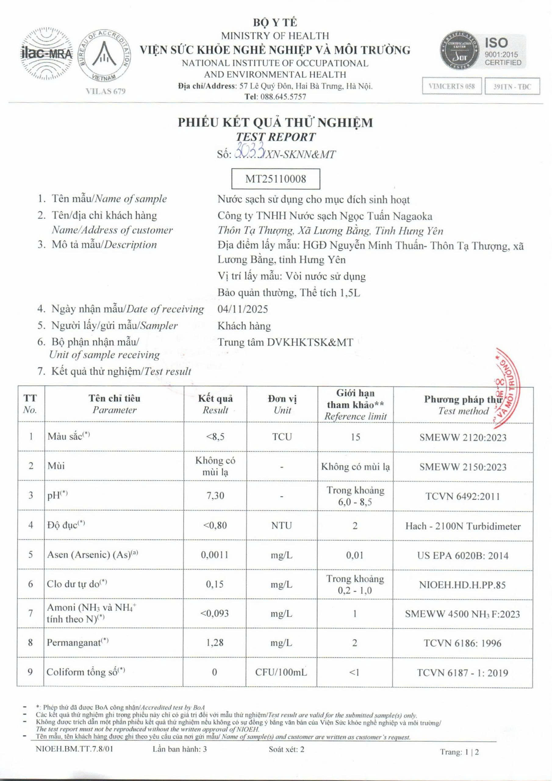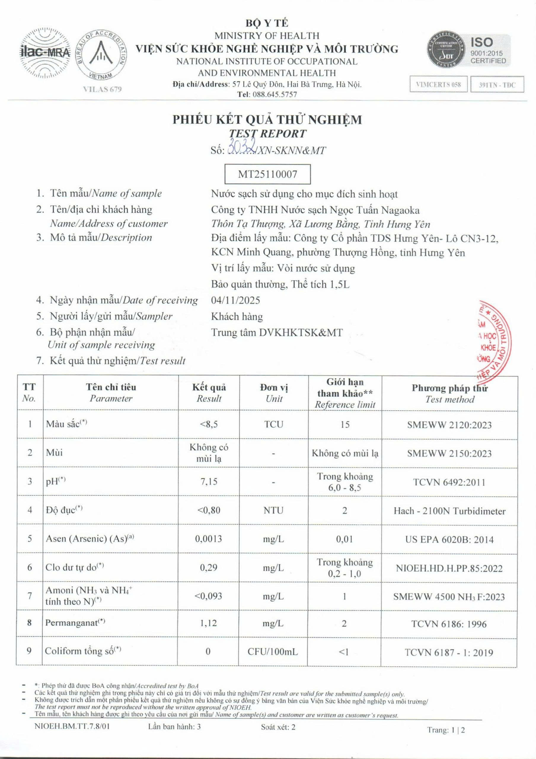 Kết quả nội kiểm mẫu nước tháng 10/2025