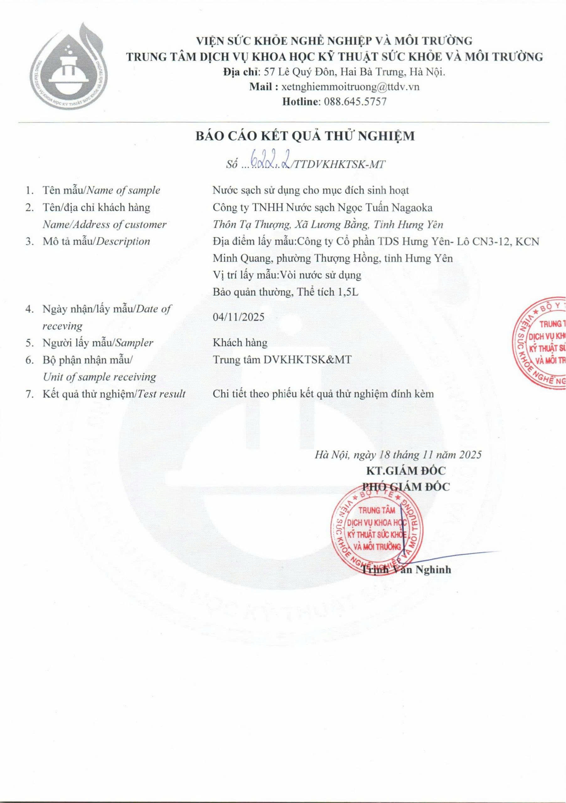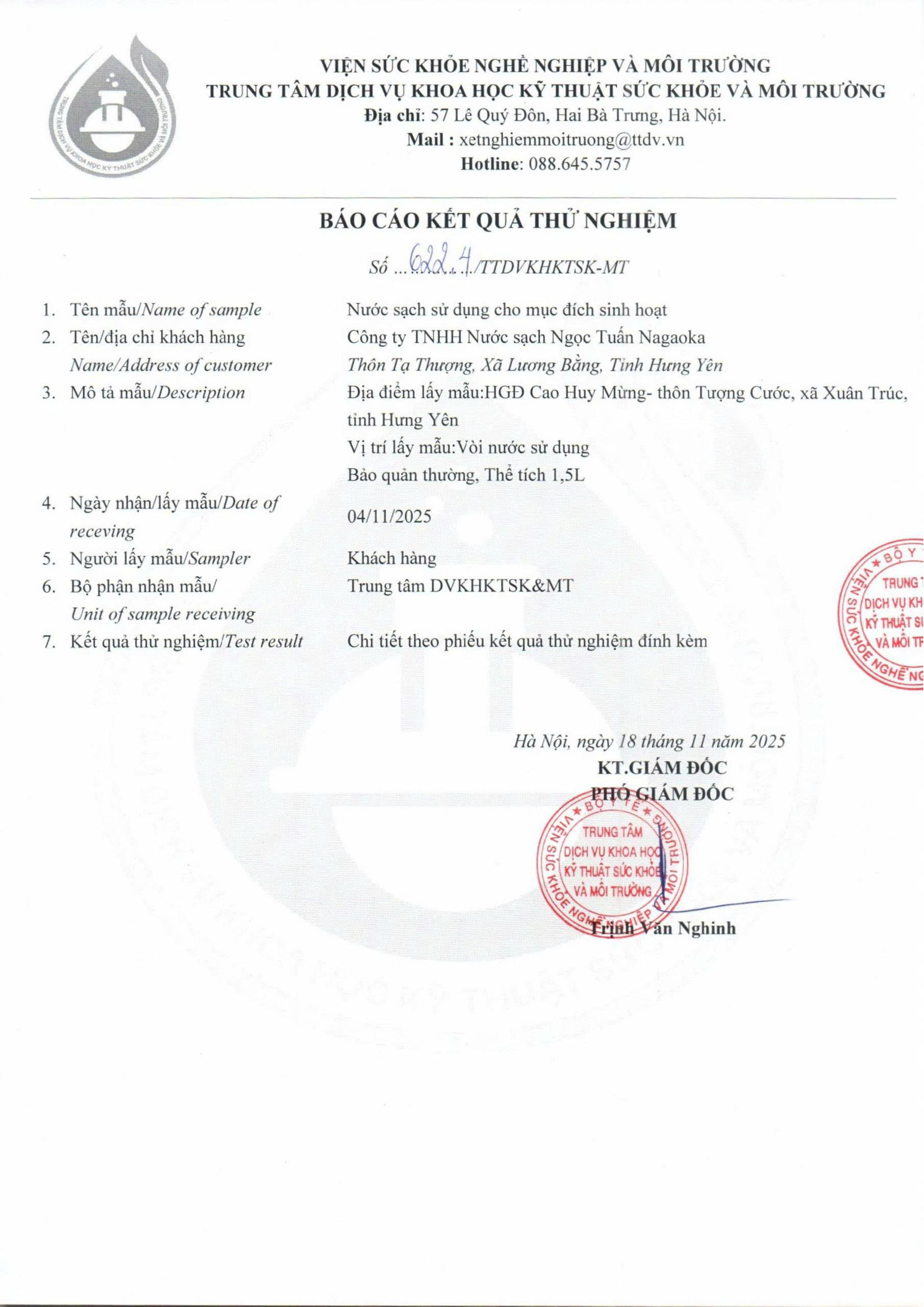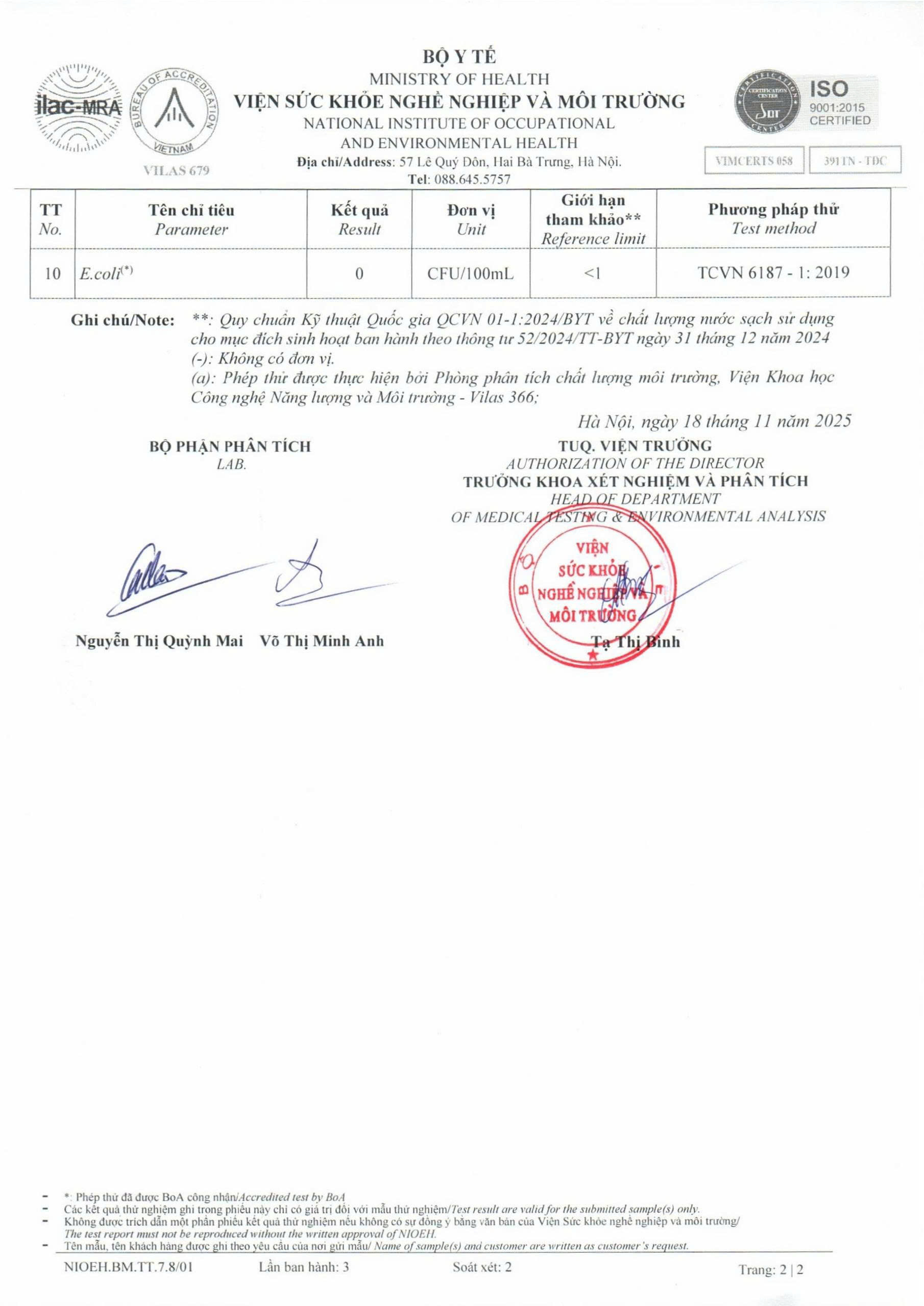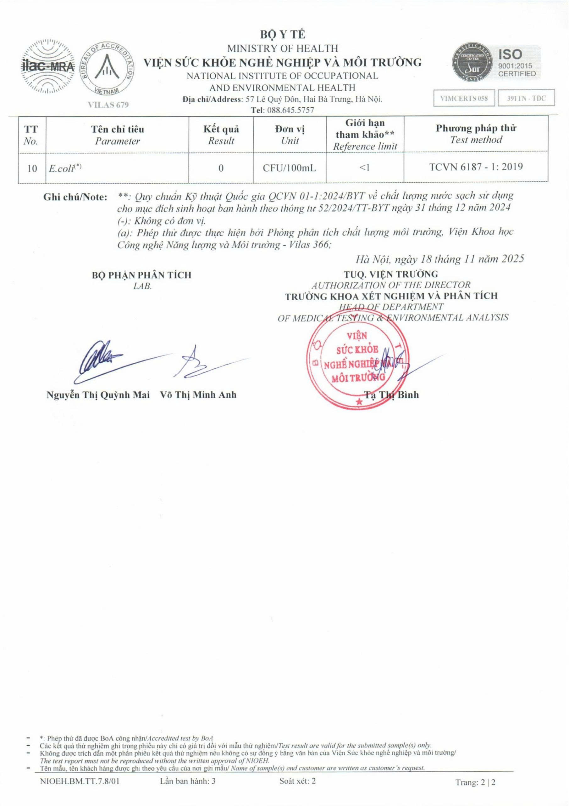 Kết quả nội kiểm mẫu nước tháng 10/2025