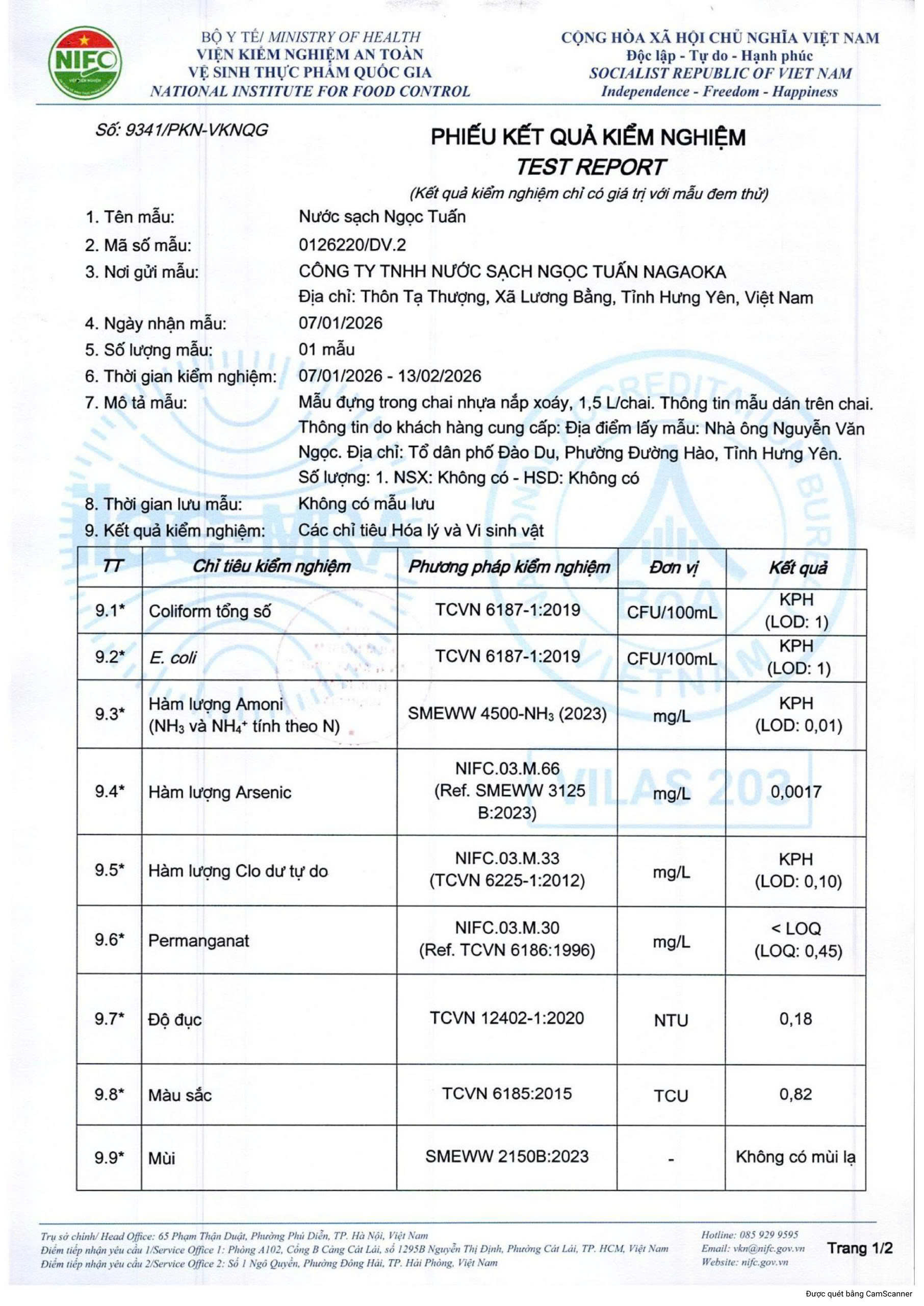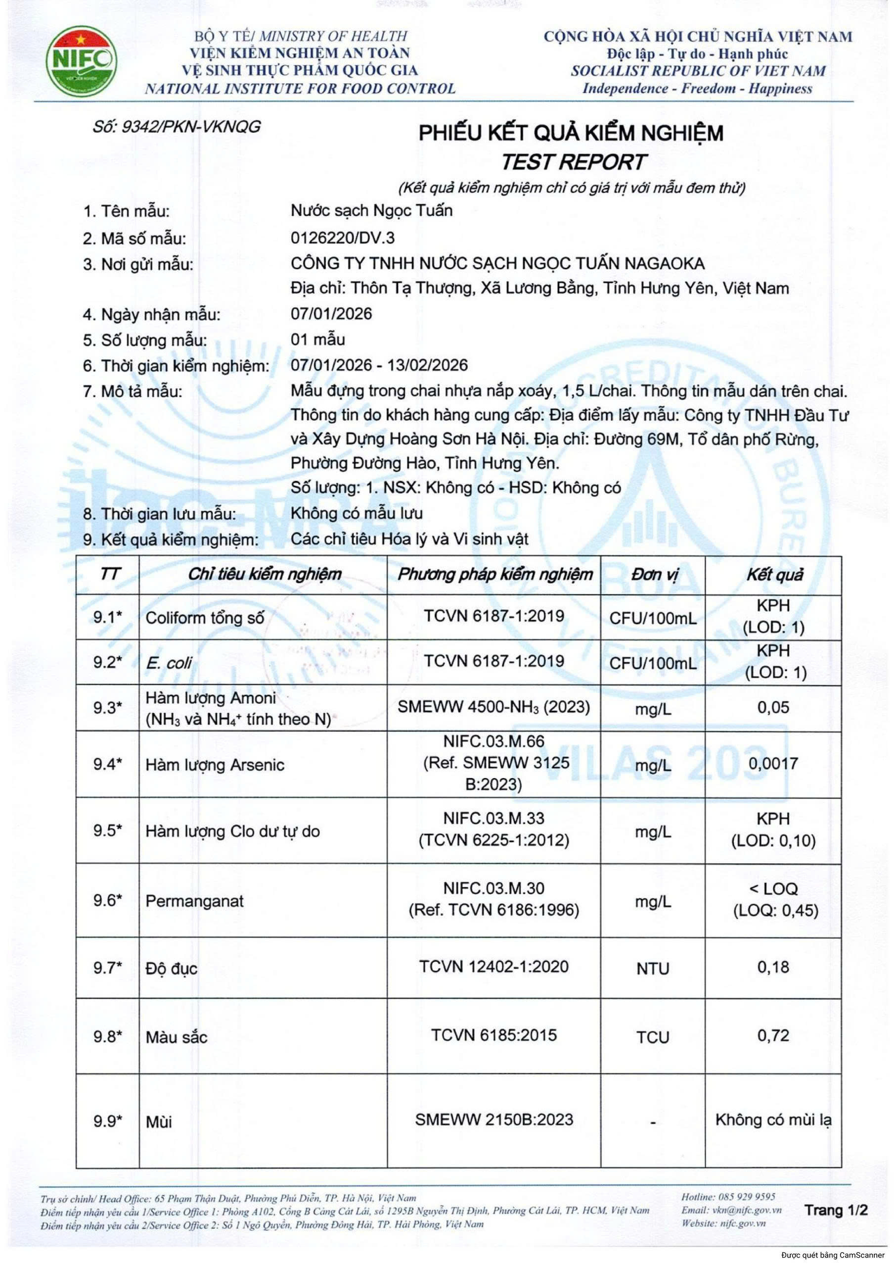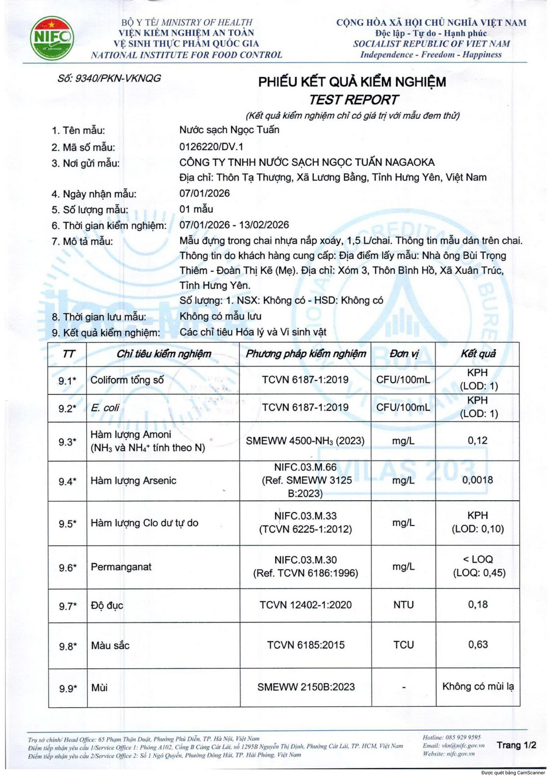 Kết quả nội kiểm mẫu nước tháng 01/2026