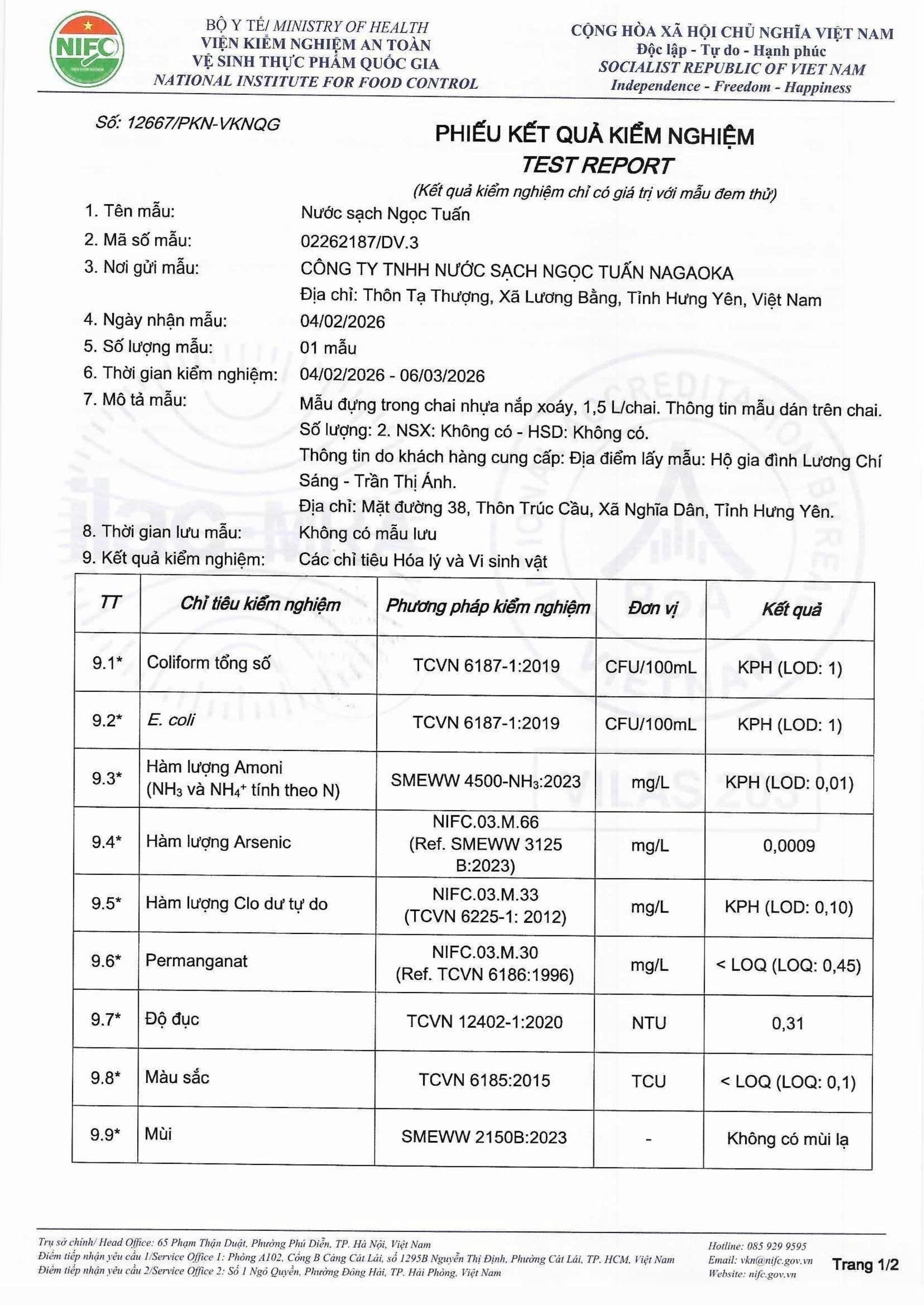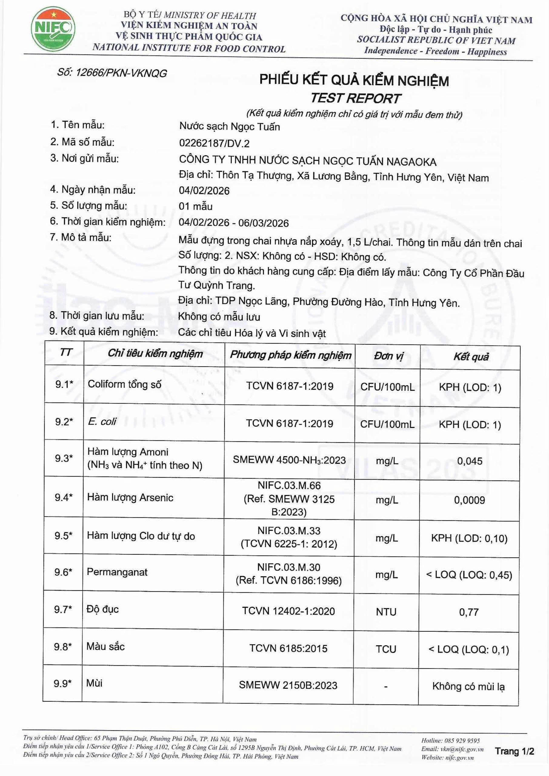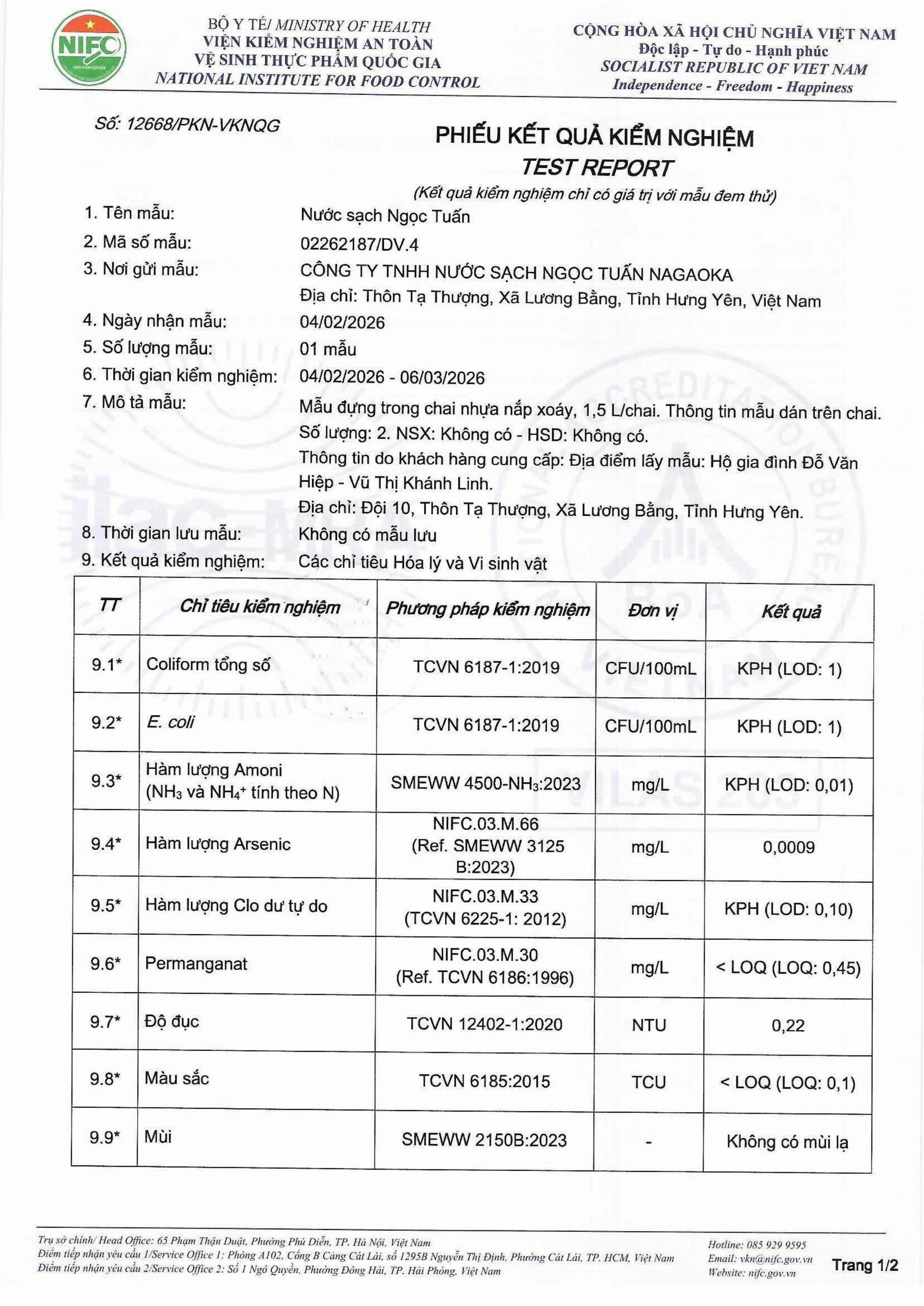 Kết quả nội kiểm mẫu nước tháng 02/2026